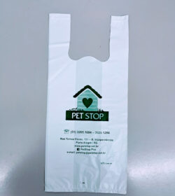 Sacolas personalizadas em plástico, com impressão em serigrafia ou flexografia. Impressão padrão 1 cor / 1 lado. Formatos padronizados em centímetros (largura x altura) e espessura (0,05 / 0,06 / 0,10 micras). Alça boca triste: 20×30 (0,05 / 0,10) – 30×40 (0,05 / 0,10 – 40×50 (0,06 / 0,10). Alça camiseta: 30×40 e 40×50 (0,05) – 50×60 (0,06) – 60×80 (0,06 / 0,09).
