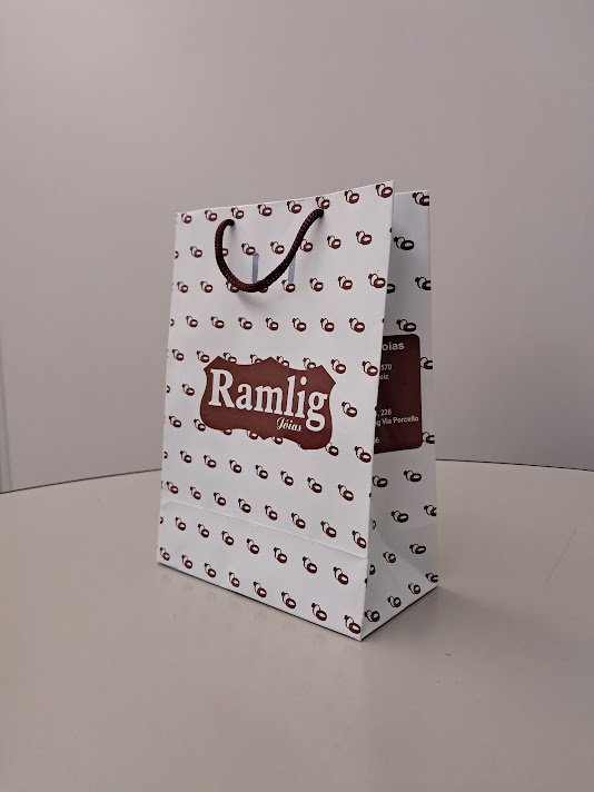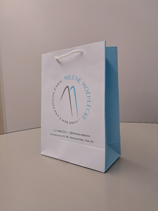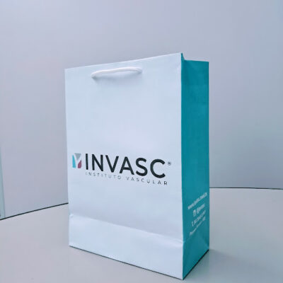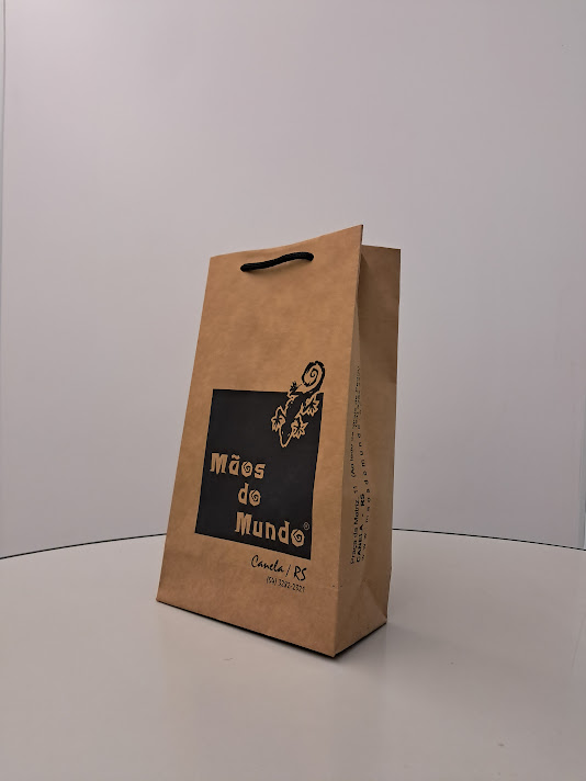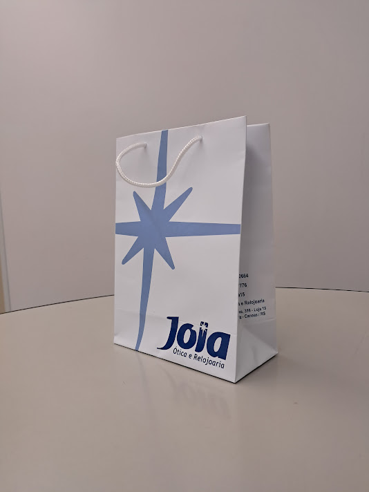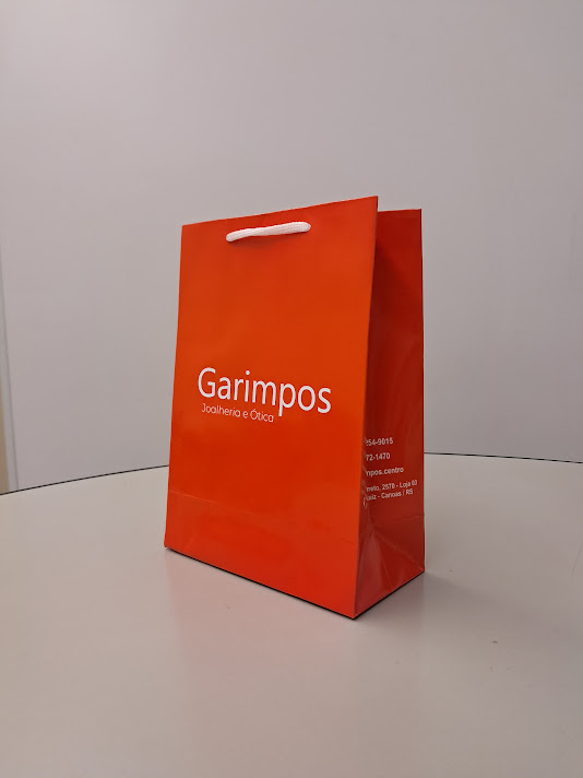 Sacolas personalizadas em papel offset, kraft, duplex, triplex. Impressão em serigrafia ou offset. Acabamento com reforço inferior e superior (dispensando o uso do ilhós). Cordão de nylon ou papel torcido em kraft natural.