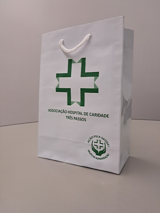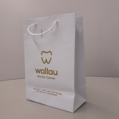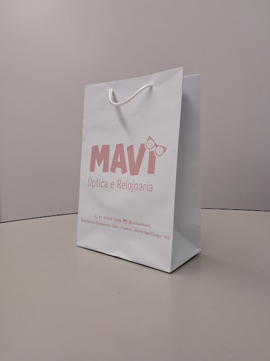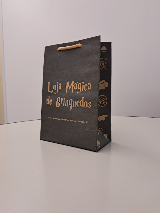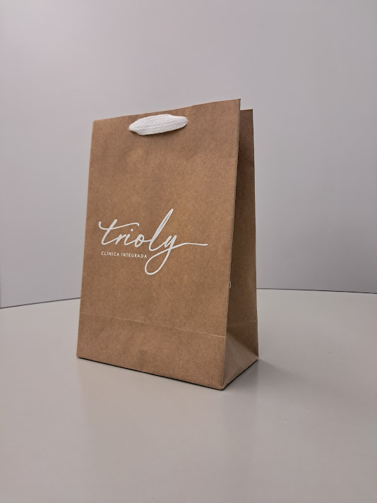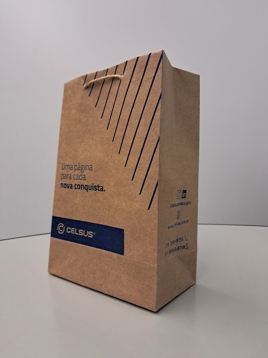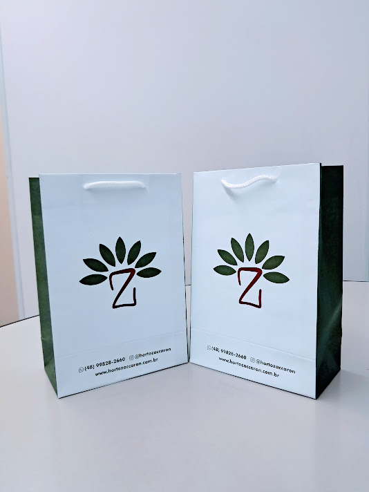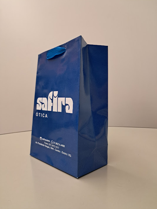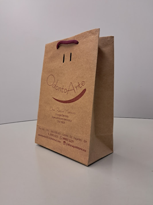 Sacolas personalizadas em papel offset, kraft, duplex, triplex. Impressão em serigrafia ou offset. Acabamento com reforço inferior e superior (dispensando o uso do ilhós). Cordão de nylon ou papel torcido em kraft natural.