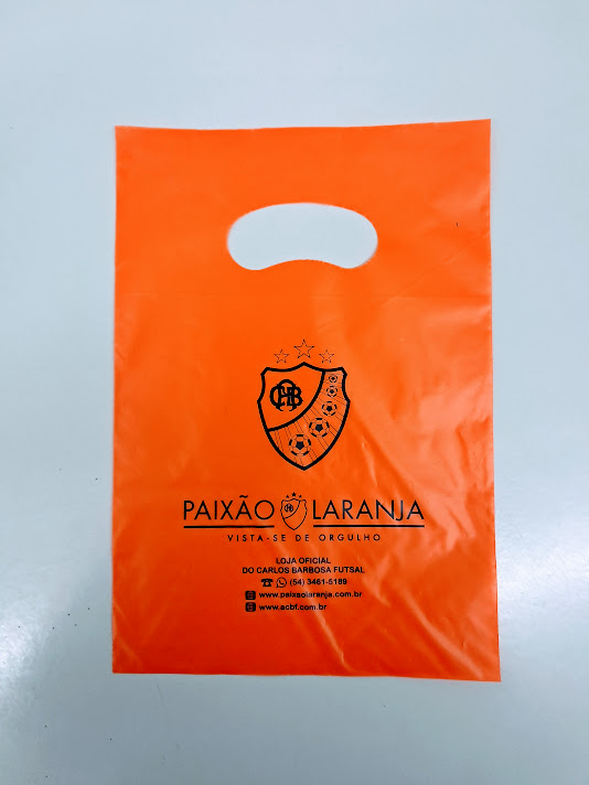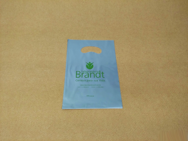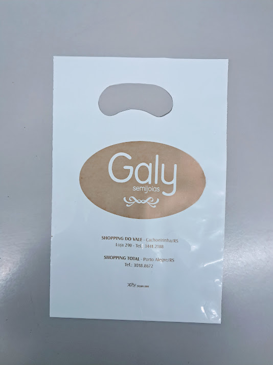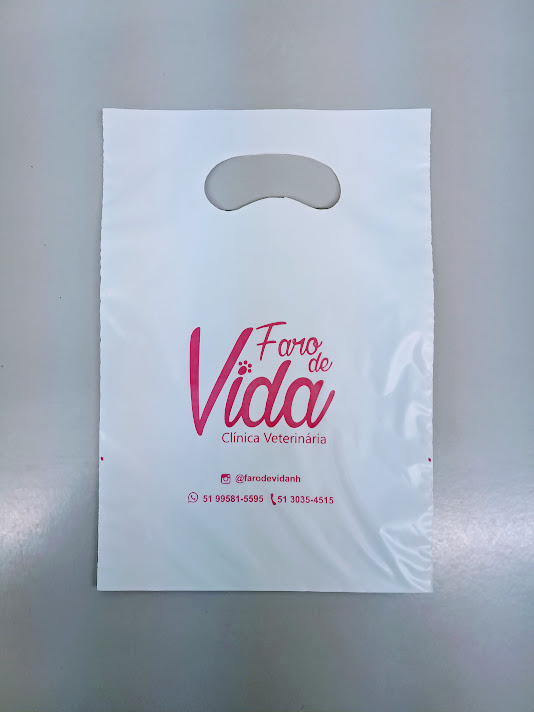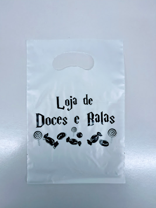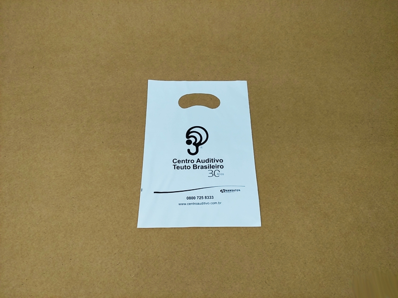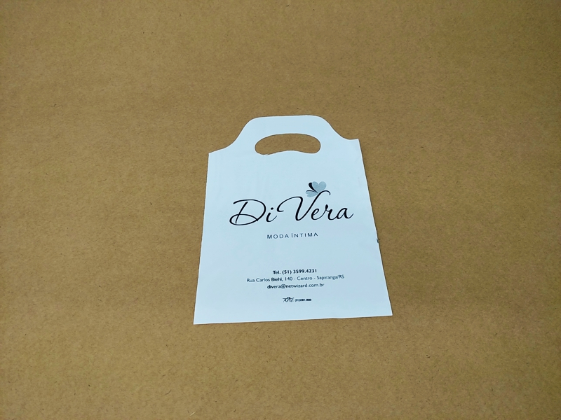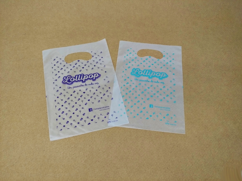 Sacolas personalizadas em plástico, com impressão em serigrafia ou flexografia. Alça Boca triste